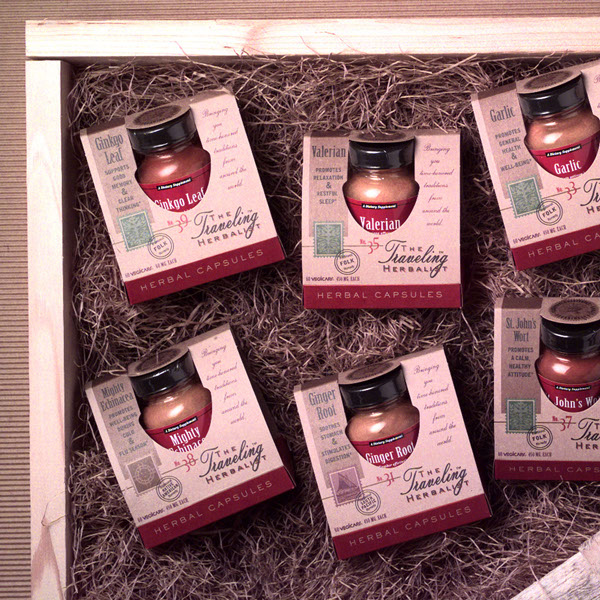 Traveling Herbalist, a company we named and branded; a line of homeopathic products as distinctive as the category. Products included tinctures, supplements, creams and teas.