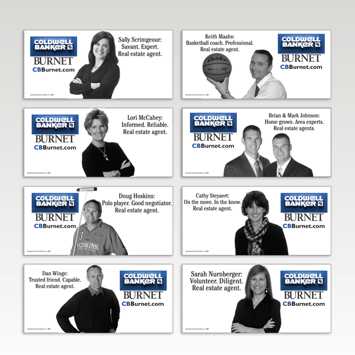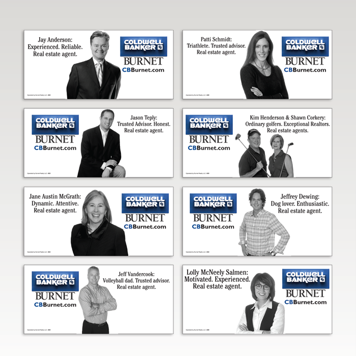 In a down real estate market what do you do? CBBurnet asked us that question and we suggested an outdoor campaign that spotlights their real estate agents. We created an in-house presentation contest that awarded 50 agents a free outdoor board and for a modest sum, an opportunity for all other agents to participate as well.